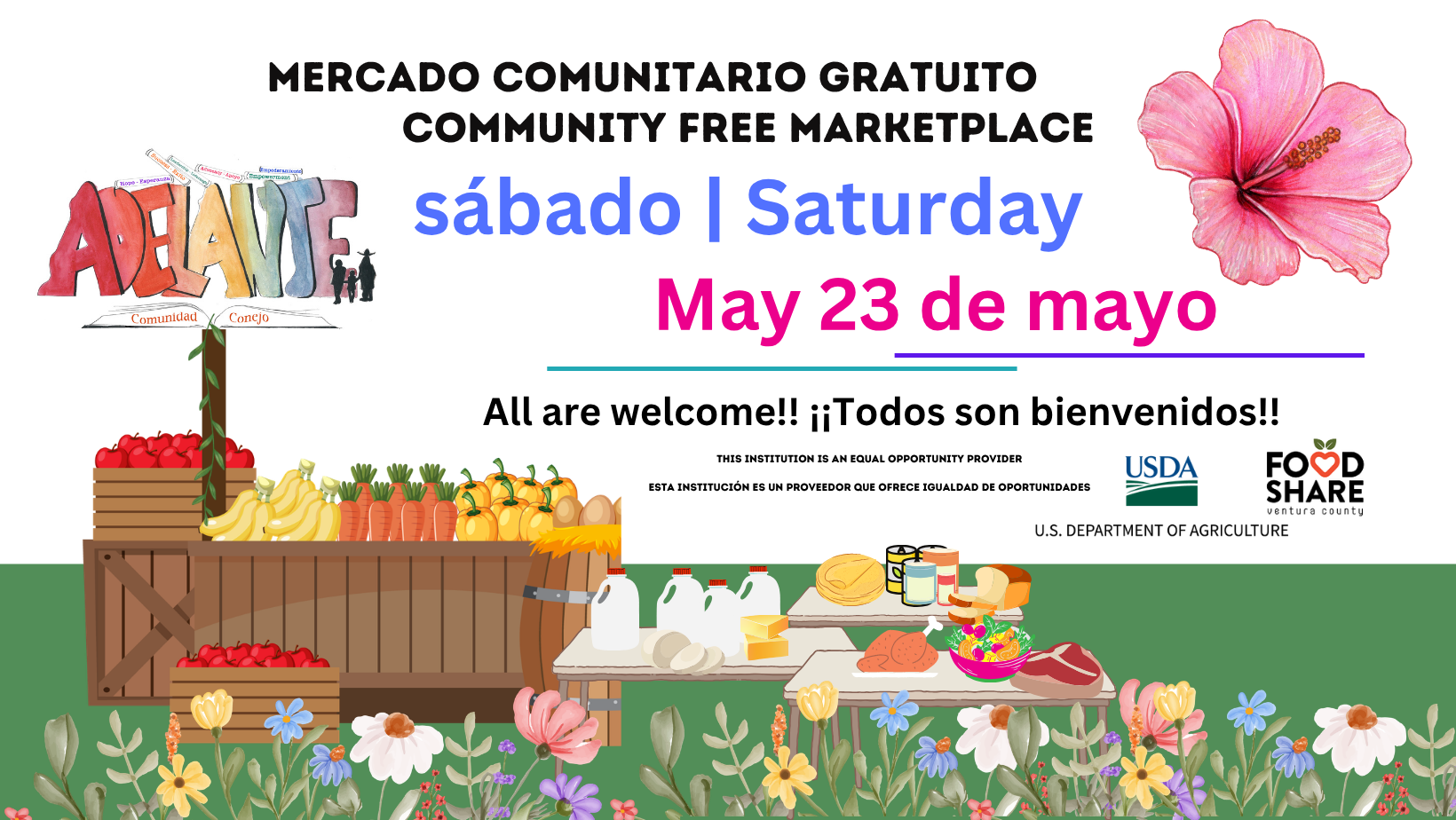 Adelante Comunidad Conejo- Saturday following 4th Friday of the month at Conejo Academy Elementary / Beyer Park 9:30 am-11:00 am Community Free Marketplace | *Holidays may change schedule for Saturday Free Marketplace
